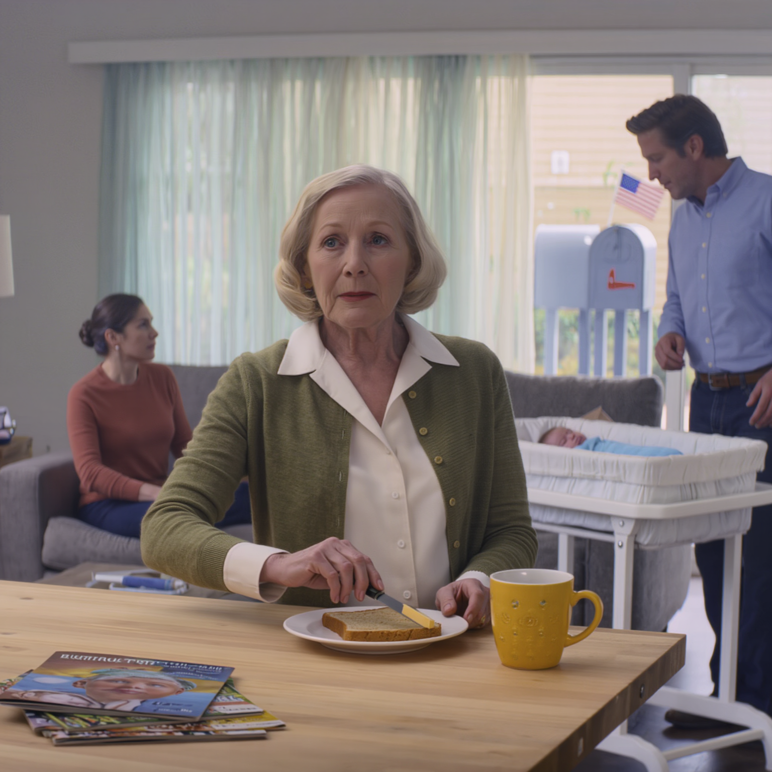 My mother sits in silence, her eyes flickering between us. Finally, she speaks, her voice soft.